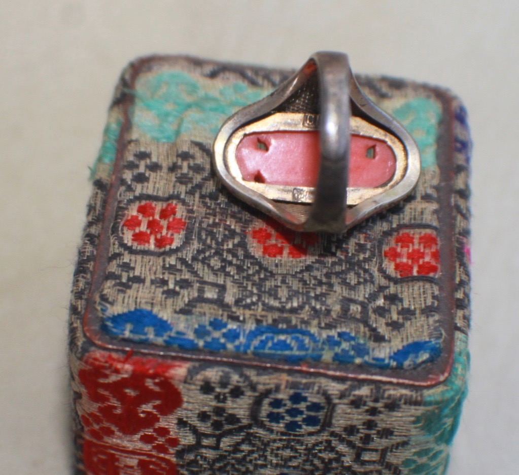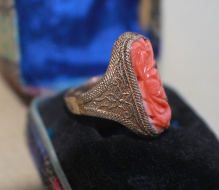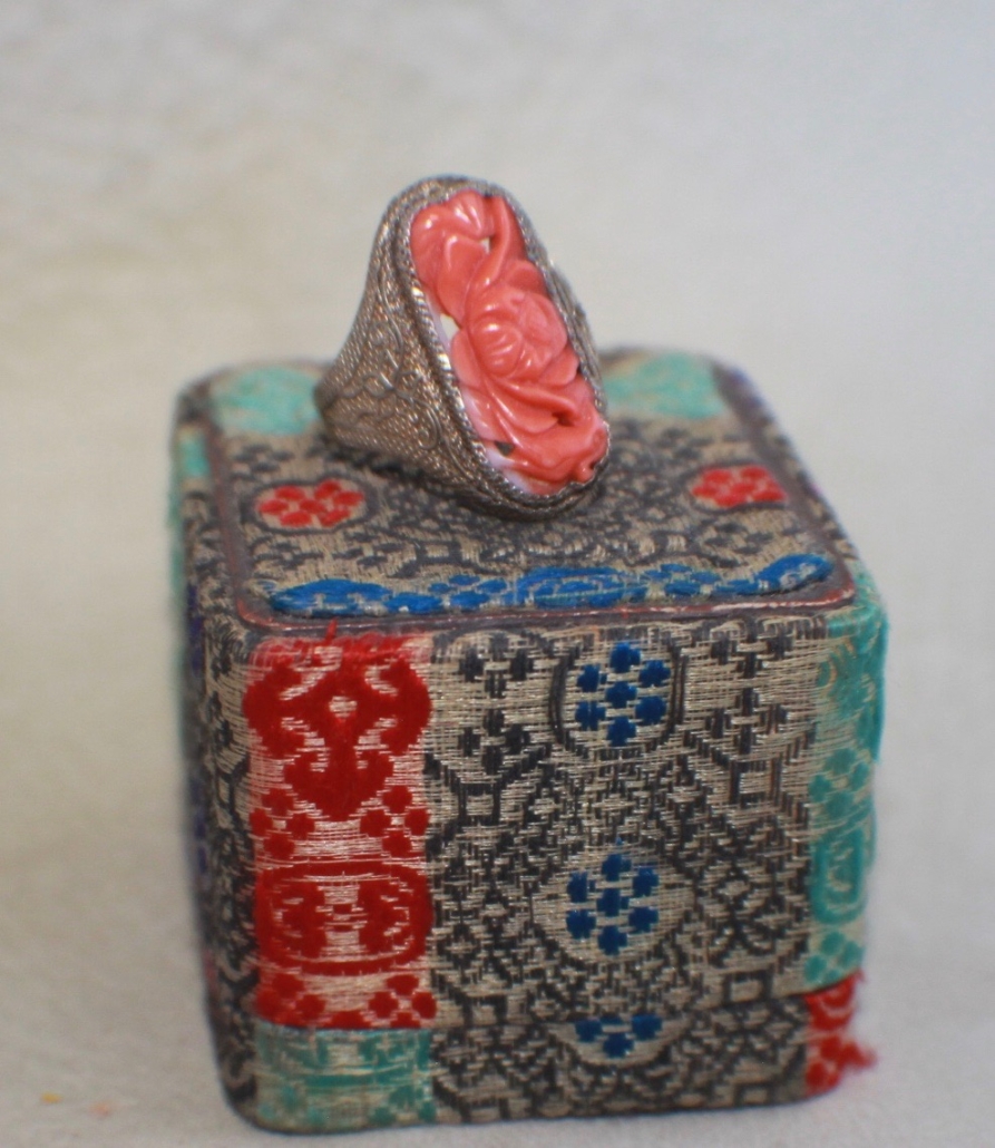 does not harm the coral. This piece was purchased in China during the 1930’s-40’s. Completely original with original silk and velvet box. Filigree intact.